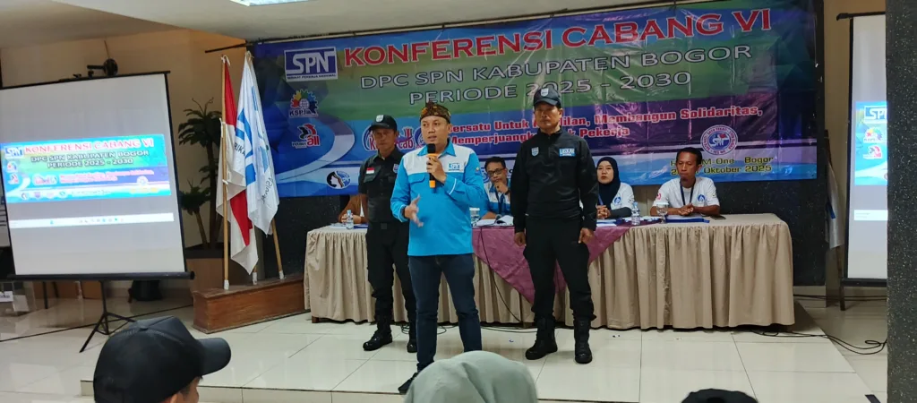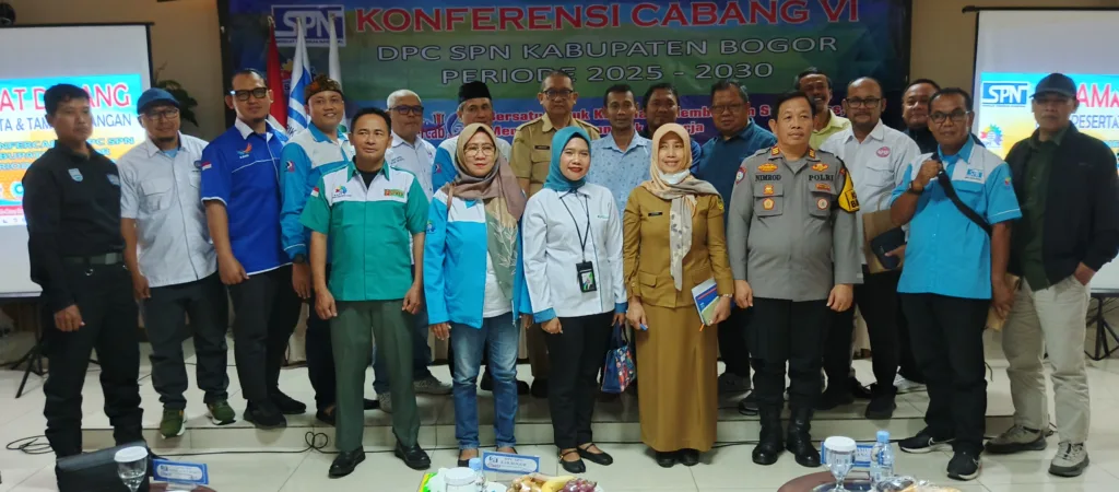 Senin, 20 Oktober 2025, Dewan Pimpinan Cabang (DPC) Serikat Pekerja Nasional (SPN) Kabupaten Bogor mengadakan Konferensi Cabang (Konfercab) VI di Hotel M-One, Jl. Raya Jakarta-Bogor No. 49, Sukaraja, Kabupaten Bogor. Dengan tema “Bersatu Untuk Keadilan, Membangun Solidaritas, Memperjuangkan Hak Pekerja”, acara ini mengundang delegasi dari Pimpinan Serikat Pekerja (PSP) SPN se-Kabupaten Bogor, perwakilan DPD SPN Provinsi Jawa Barat, DPC SPN Kota Bogor, DPC SPN Kota Depok, Kapolsek Kabupaten Bogor, BPJS, Pemerintah Kabupaten Bogor, serta DPRD Kabupaten Bogor.
